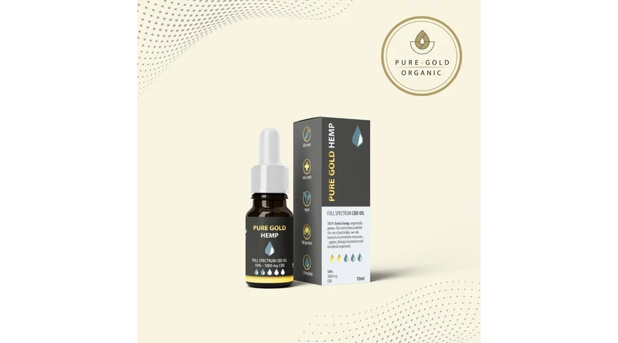 A Pure Gold Hemp 10% teljes spektrumú kender virágzat kivonat 10ml-es kiszerelése összesen 1000mg hatóanyagot kannabidiolt tartalmaz.